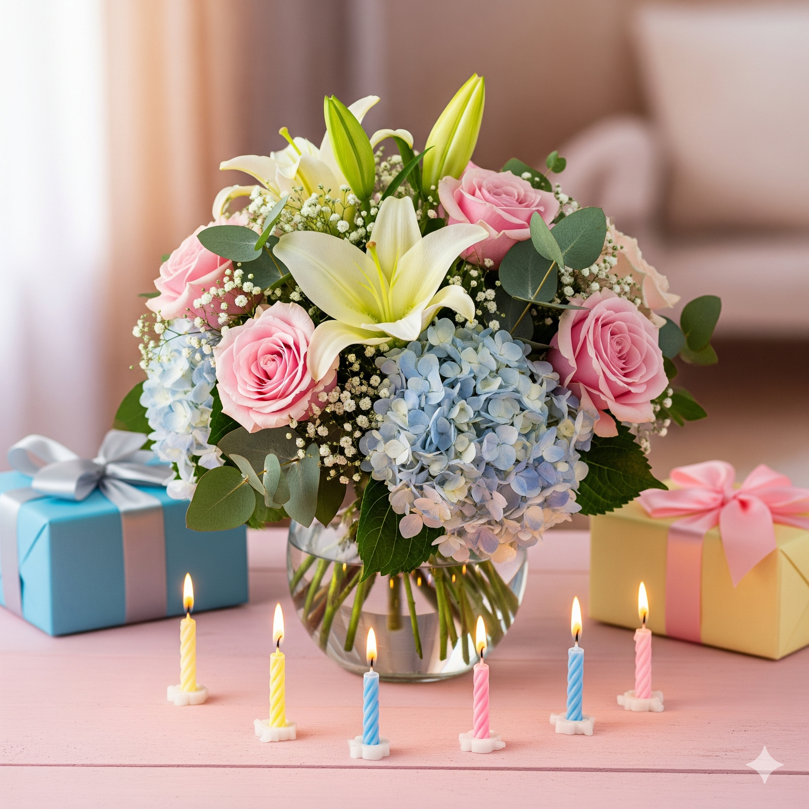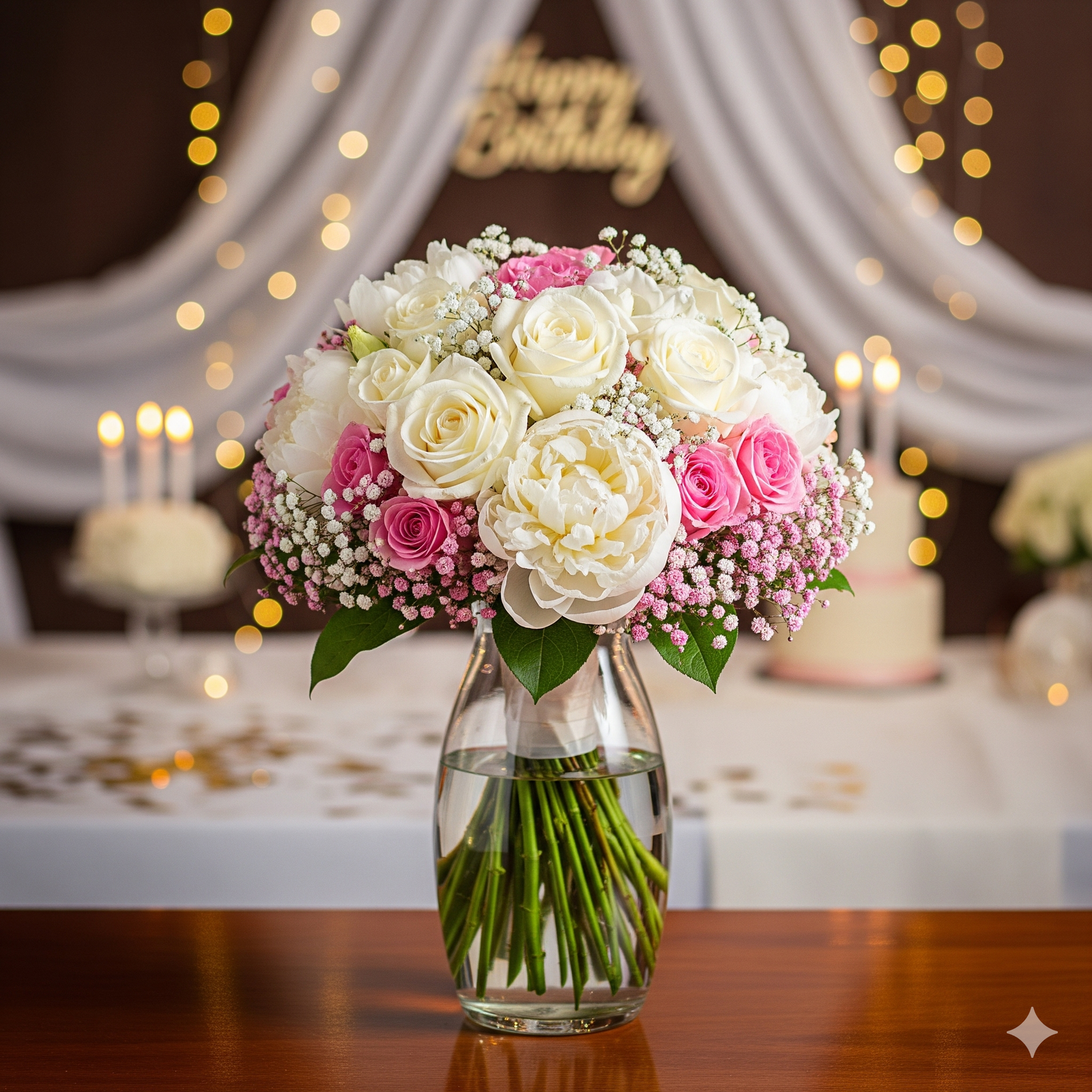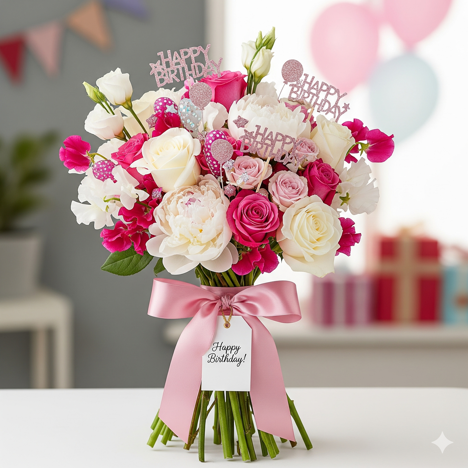 Celebrate birthdays with sophistication using our Elegant White & Pink Birthday Bouquet. Combining pristine white lilies with soft pink roses and delicate greenery, this bouquet embodies grace and charm. Perfect for those who appreciate elegance, it conveys heartfelt wishes in a refined style. Each bloom is selected for freshness and arranged to create a balanced, harmonious bouquet, making it a beautiful centerpiece or a thoughtful gift that leaves a lasting impression.