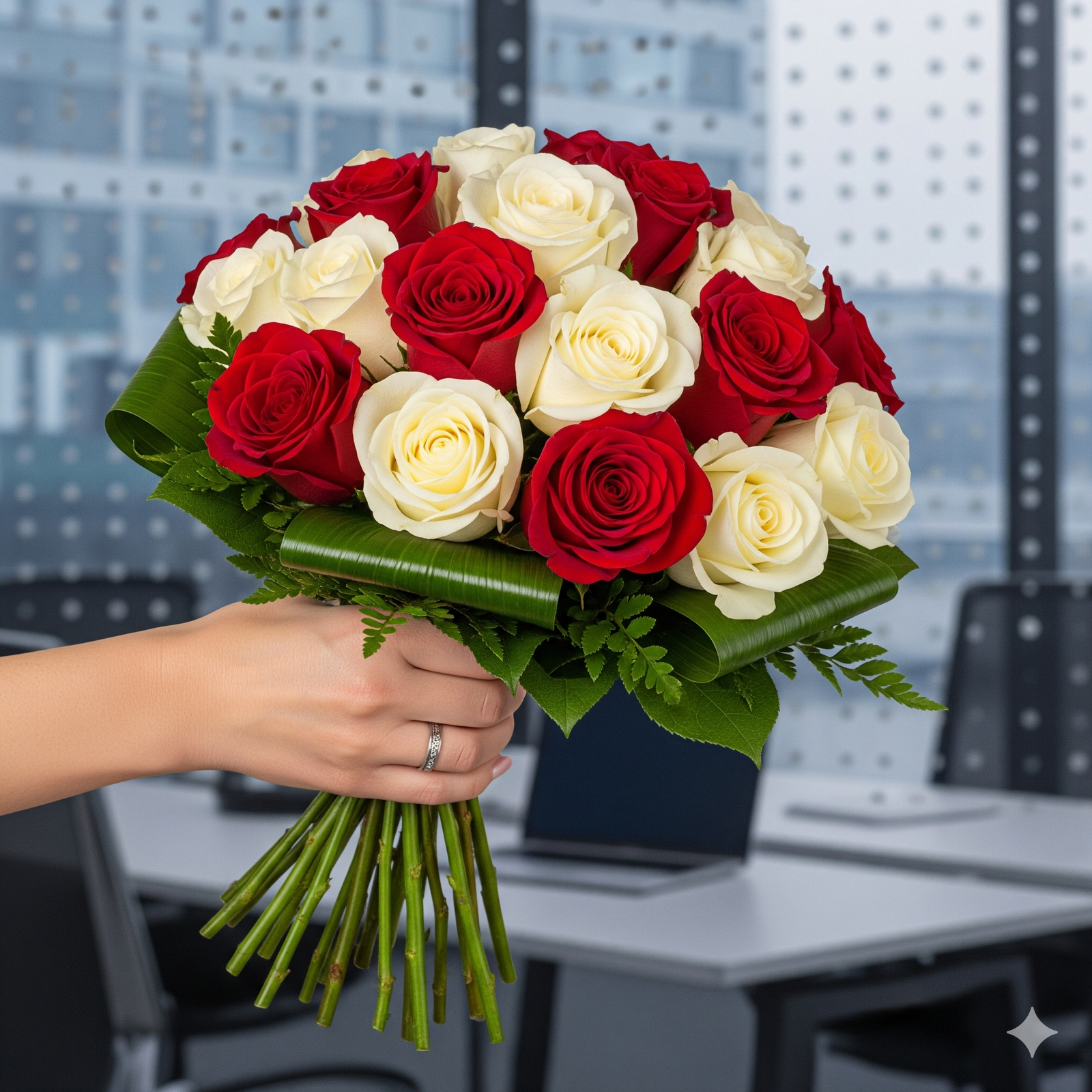 Impress clients, colleagues, or business partners with our Executive Elegance Roses Bouquet. A refined mix of red and white roses conveys professionalism, appreciation, and elegance. Perfect for corporate celebrations, boardroom gifting, or employee recognition, each bloom is carefully selected for freshness and arranged in a sleek, modern style. This bouquet represents respect and success in every petal.