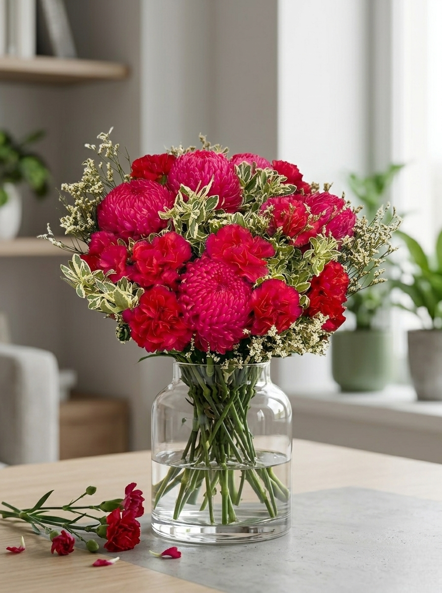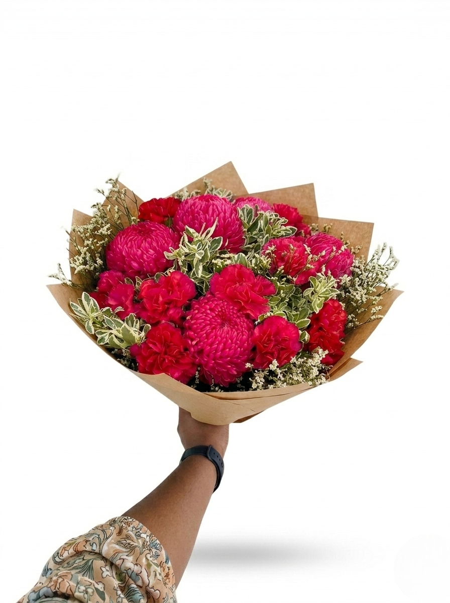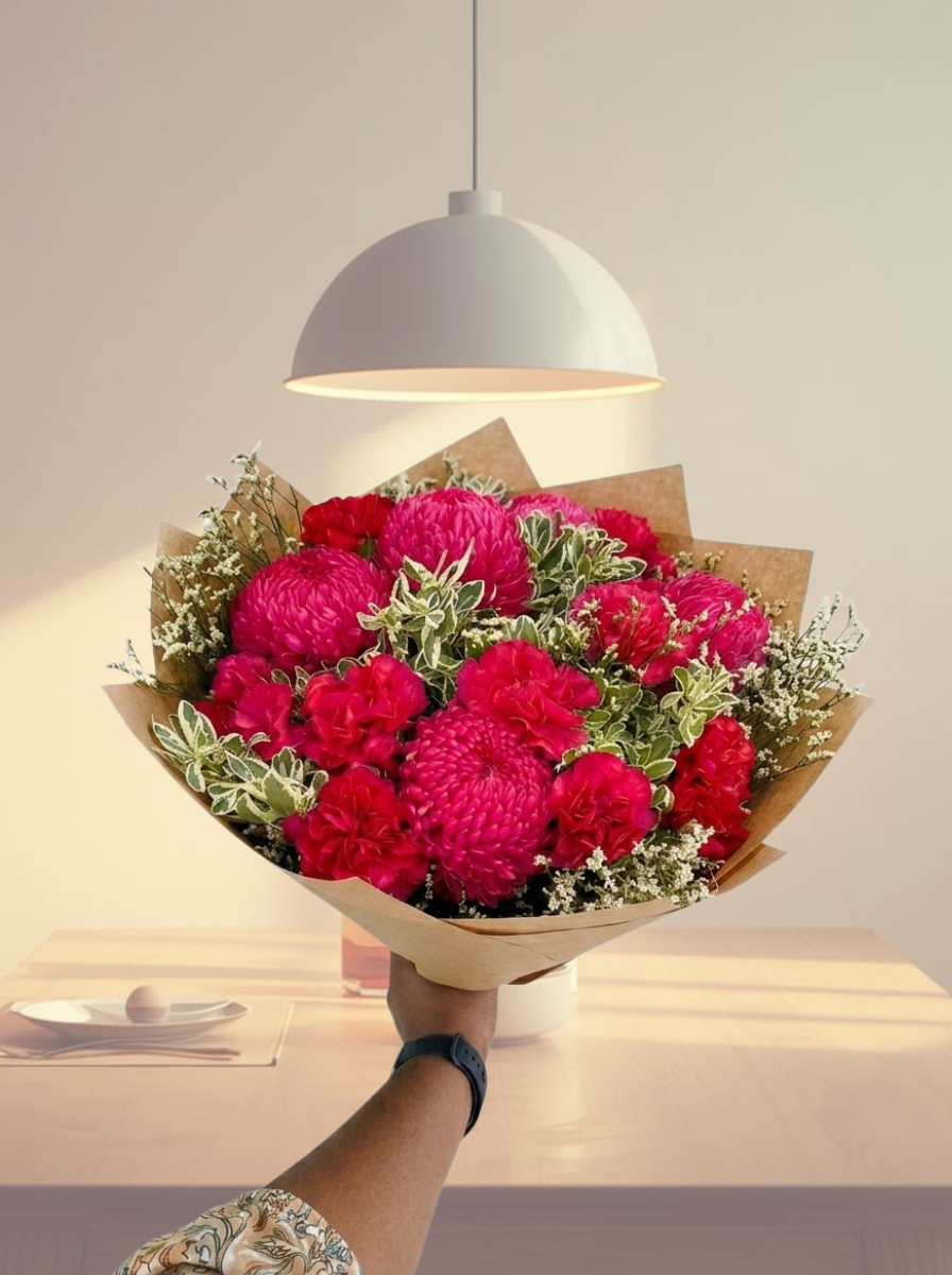 Featuring a lush mix of deep magenta chrysanthemums and classic crimson carnations, this arrangement offers a striking monochromatic look that radiates energy. Sprigs of delicate white filler flowers and variegated greenery add airy movement and a fresh, garden-picked feel. Whether it’s a centrepiece for a dinner party or a thoughtful gift for a loved one, this bouquet fits seamlessly into both modern and rustic interiors.