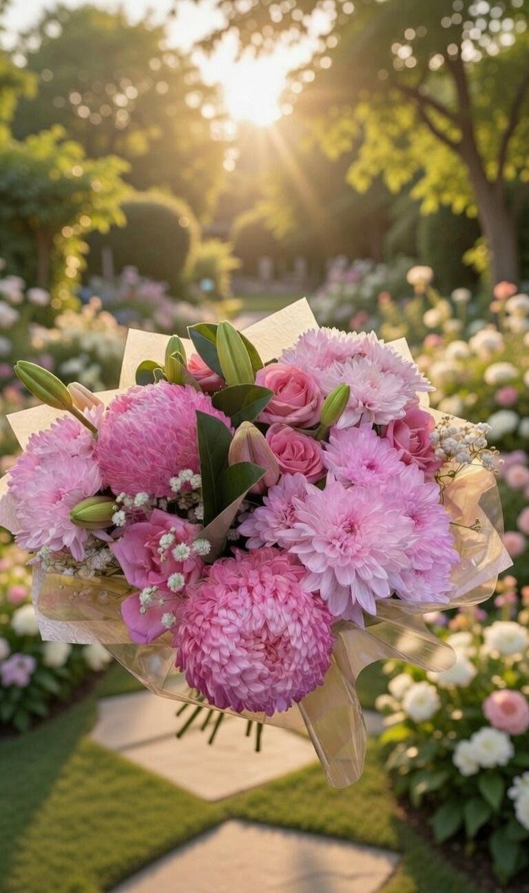 A beautiful arrangement of soft pink roses, mums, chrysanthemums, and lilies creates a fresh and elegant floral display.
