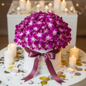 Charm and elegance come alive in our Purple Orchid Bloom Box, where vivid purple orchids are beautifully arranged in a luxurious round box adorned with soft satin ribbons. The rich tones and graceful form of the orchids create an exotic, eye-catching display that feels both modern and timeless. Perfect for anniversaries, premium gifting, or elevating any space, this enchanting arrangement adds a refined touch of sophistication and lasting beauty.