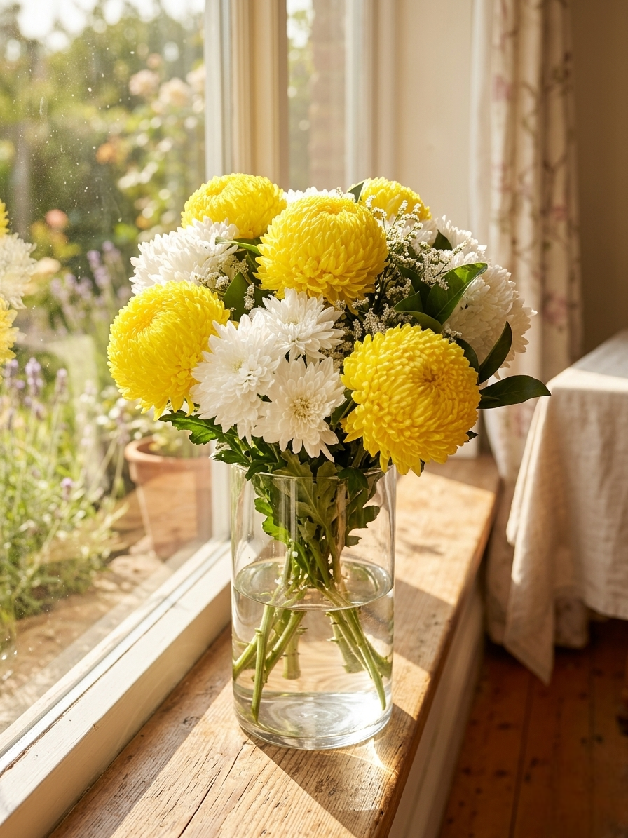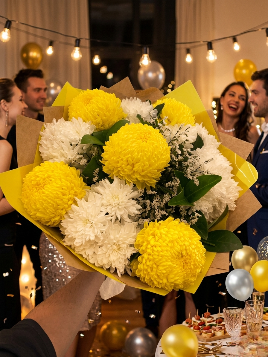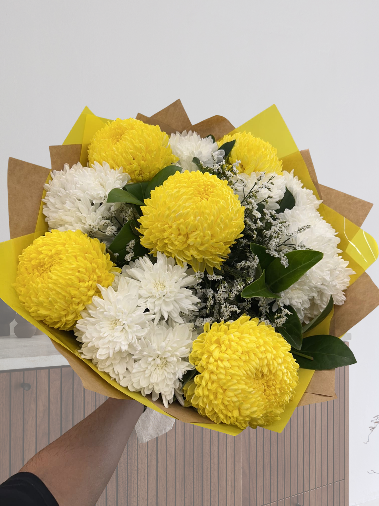 The stars of this bouquet are the premium golden-yellow and snow-white chrysanthemums. Hand-selected for their massive, pompon-like heads and symmetrical petal structures, they symbolize long life and pure joy.